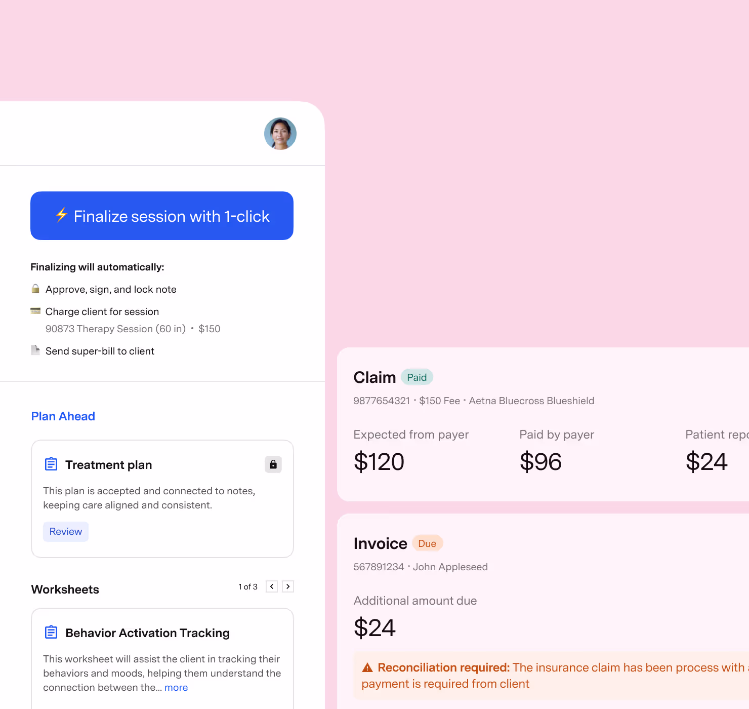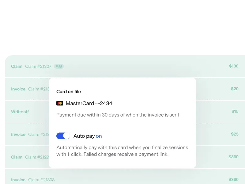 Finish the session without the usual scramble. Finalize notes, update treatment plans, submit claims, and process payments from a single screen with a single click.