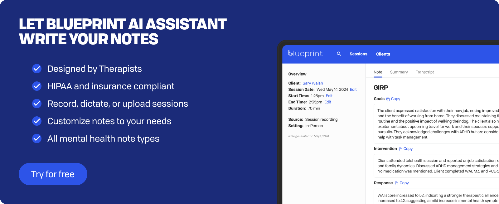 Blueprint is a HIPAA-compliant AI Assistant built with therapists, for the way therapists work. Trusted by over 50,000 clinicians, Blueprint automates progress notes, drafts smart treatment plans, and surfaces actionable insights before, during, and after every client session. That means saving about 5-10 hours each week — so you have more time to focus on what matters most to you.