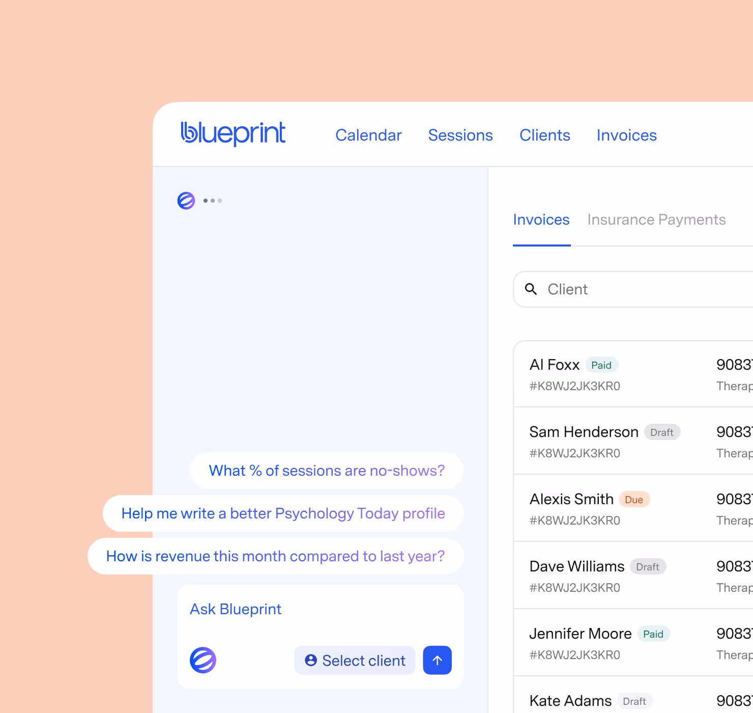 Yes. Blueprint is HIPAA-compliant and built specifically for mental health practices. Client data is stored securely and handled according to healthcare privacy and security requirements.