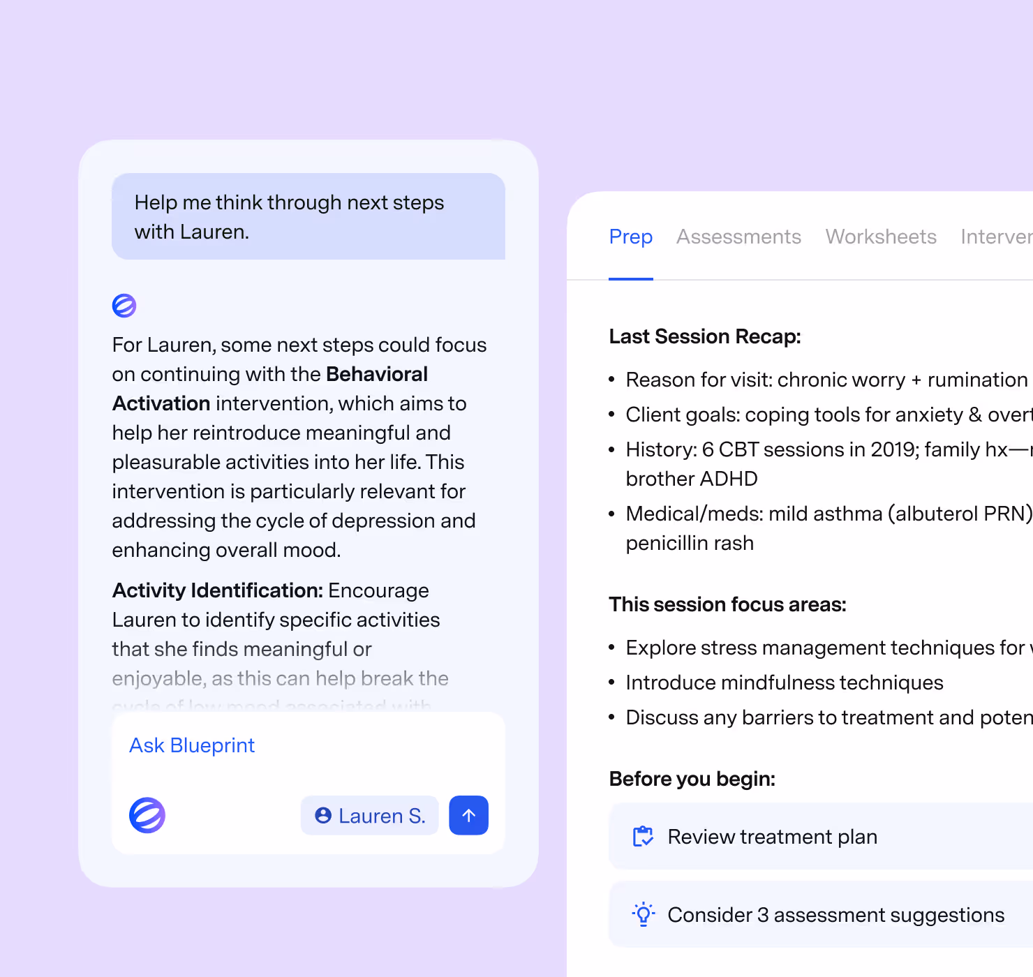 Stay oriented, with a partner for clinical thinking. See recaps from prior sessions, highlighted focus areas, and suggested assessments, worksheets, or guided interventions. When a case feels stuck or progress has plateaued, you can ask for help thinking through next steps or alternative approaches.