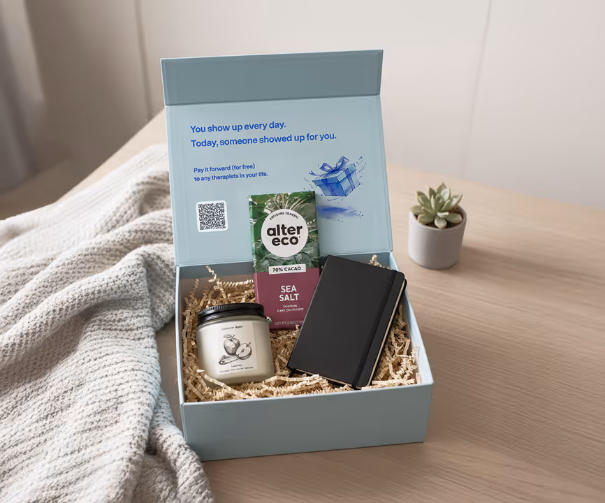 Choose a therapist you know who deserves a little extra support, and weâll handle the rest. Weâll reach out, collect their mailing address, and send them a curated box of thoughtful, restorative itemsâon us. You can add a personalized note reminding them that their work truly matters. Itâs a simple, tangible way to say: we see you, we value you, and you donât have to carry this alone.
